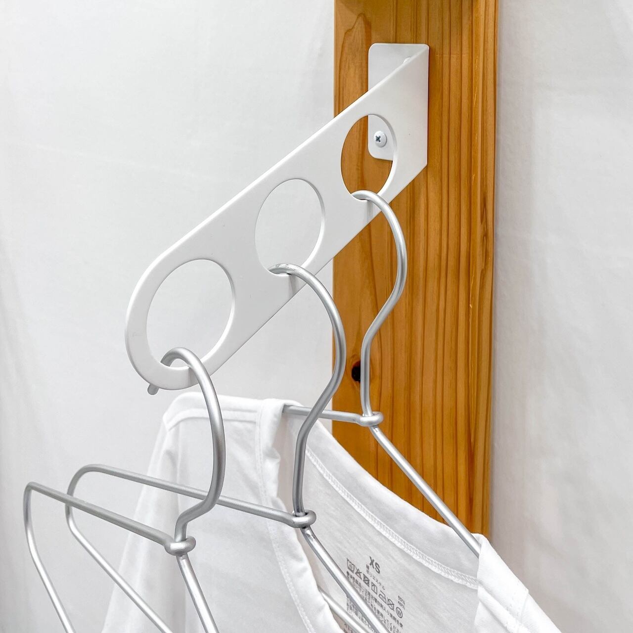 段差のある3つの穴を備えた便利なハンガーフックです。衣類を重ねて掛けることができ、お出かけ前の服をかけておくことができます。